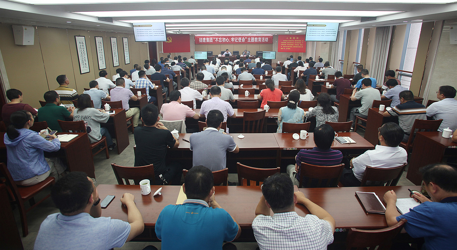 揚(yáng)建網(wǎng)訊 為紀(jì)念中國共產(chǎn)黨成立97周年,結(jié)合集團(tuán)2018年黨建工作總體要求,不斷增加黨組織的創(chuàng)造力、凝聚力和戰(zhàn)斗力,進(jìn)一步推動集團(tuán)各項(xiàng)改革發(fā)展工作 ,7月8日下午,集團(tuán)黨委在揚(yáng)州運(yùn)河城市廣場B座14樓會議室舉辦了“不忘初心、牢記使命”主題教育活動?;顒佑牲h委副書記張振新同志主持,集團(tuán)在揚(yáng)黨委委員、高管、總部及基層黨員干部共115人參加。