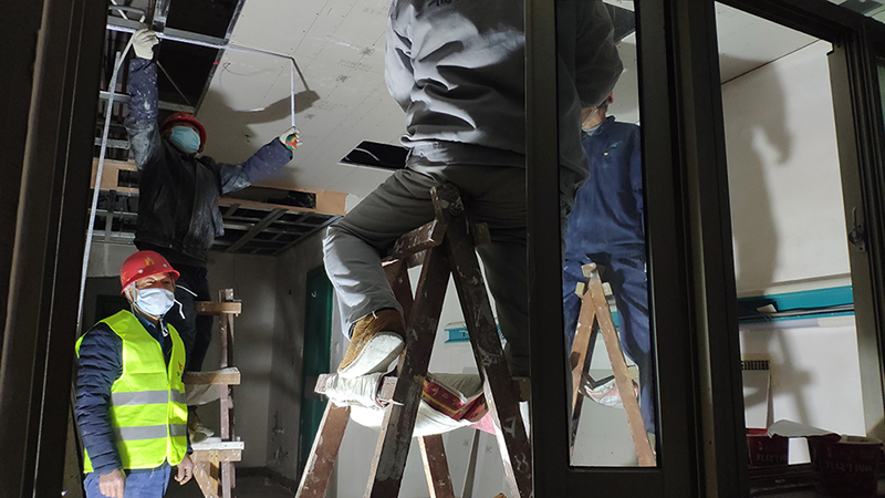 正月初五,正當(dāng)大家自我隔離閉門不出的時(shí)候,華發(fā)建設(shè)者們放棄了與家人團(tuán)聚的時(shí)光,無懼個(gè)人安危,勇赴一線,開啟了一場爭分奪秒的疫情防控施工的硬核戰(zhàn)。早上七點(diǎn)多操作工、木工、油漆工、水電工各自領(lǐng)到了作業(yè)面,華發(fā)20多名管理人員、64名施工人員,迅速投入到緊張的施工中。初六開始,現(xiàn)場施工人員多達(dá)200余人,他們晚上加班加點(diǎn)施工,爭取盡早完成項(xiàng)目。