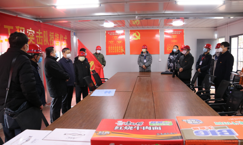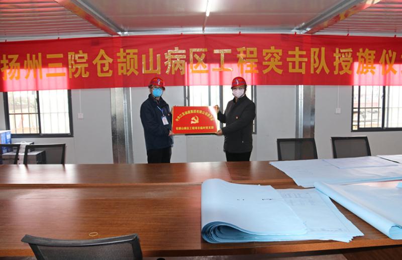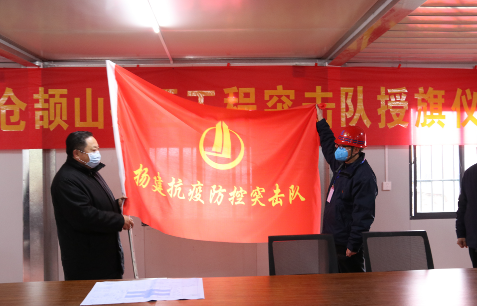王主任在向我集團蒼頡山病區(qū)項目臨時黨支部書記、揚建抗疫防控突擊隊隊長郝敬東授旗,并希望揚建抗疫防控突擊隊能夠克服一切困難,始終發(fā)揚揚建人特別能吃苦、特別能戰(zhàn)斗、特別能奉獻的精神,牢固樹立龍頭企業(yè)的使命意識、擔(dān)當(dāng)意識,確保高質(zhì)量、高效率完成市委市政府交辦的建設(shè)任務(wù),為疫情防控做貢獻。