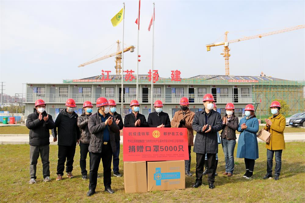 3月11日下午,揚(yáng)州市總工會(huì)副主席韓士軍、建設(shè)工會(huì)主任范華及建管單位相關(guān)負(fù)責(zé)人,來到我集團(tuán)承建的廣陵教育文化產(chǎn)業(yè)基地項(xiàng)目(初中部)工程項(xiàng)目部,在集團(tuán)人力資源部、工會(huì)的陪同下,向項(xiàng)目部捐贈(zèng)了口罩,并對(duì)企業(yè)的復(fù)工復(fù)產(chǎn)作了指導(dǎo)。