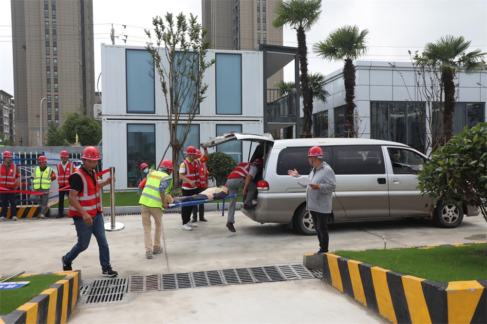 揚建網(wǎng)訊 為認(rèn)真貫徹落實習(xí)近平總書記的一系列重要講話精神,健全安全生產(chǎn)責(zé)任落實,檢驗重點項目在建工程應(yīng)急救援預(yù)案的可行性和操作性,提高員工的安全意識以及在緊急情況下的應(yīng)變和自救能力,6月24日上午,揚州頤和醫(yī)療健康中心項目組織開展安全事故應(yīng)急救援演練,項目部全員參與應(yīng)急演練。城控集團、城建置業(yè)以及我集團公司領(lǐng)導(dǎo)現(xiàn)場觀摩。