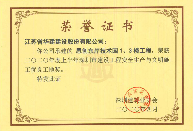 又訊:深圳工程處承建的寧佳花園工程被評為“2020年廣東省建設(shè)工程金匠獎”及廣東省建設(shè)工程優(yōu)質(zhì)獎;思創(chuàng)東岸技術(shù)園1、3號樓工程榮獲2020年上半年深圳市建設(shè)工程安全生產(chǎn)與文明施工優(yōu)良工地獎。