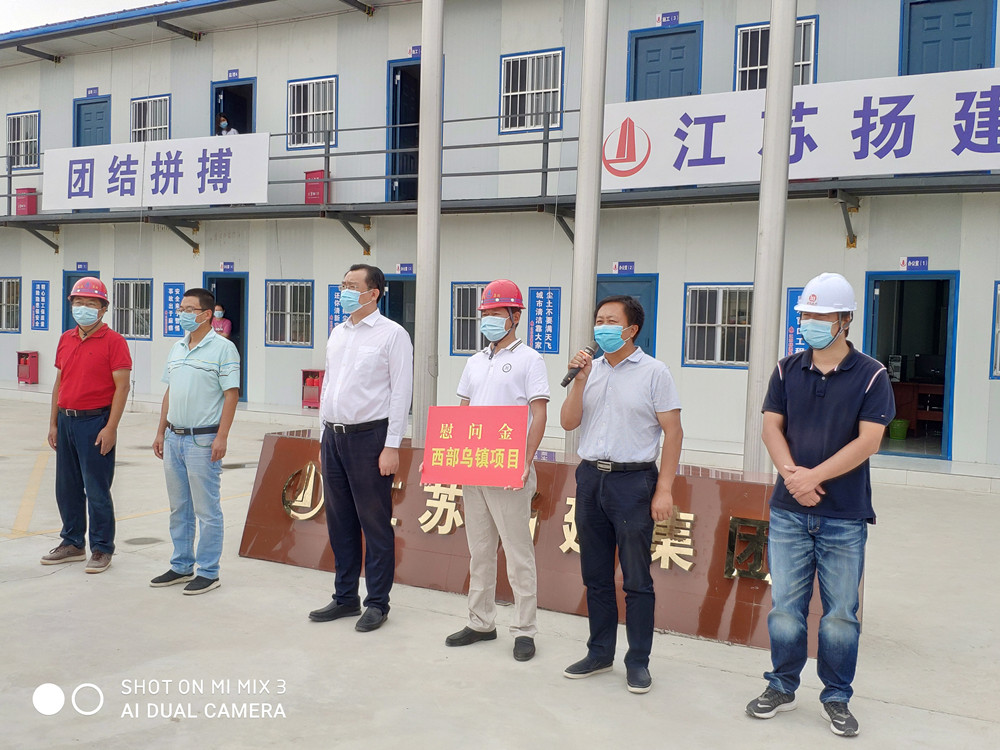 揚(yáng)建網(wǎng)訊 8月27日,新疆克拉瑪依市烏爾禾區(qū)、鎮(zhèn)兩級(jí)黨政領(lǐng)導(dǎo)一行來到揚(yáng)建集團(tuán)新疆西部烏鎮(zhèn)項(xiàng)目部,為在防疫抗疫期間克服困難、積極配合防疫工作、堅(jiān)持生產(chǎn)的項(xiàng)目施工人員發(fā)放慰問金。
