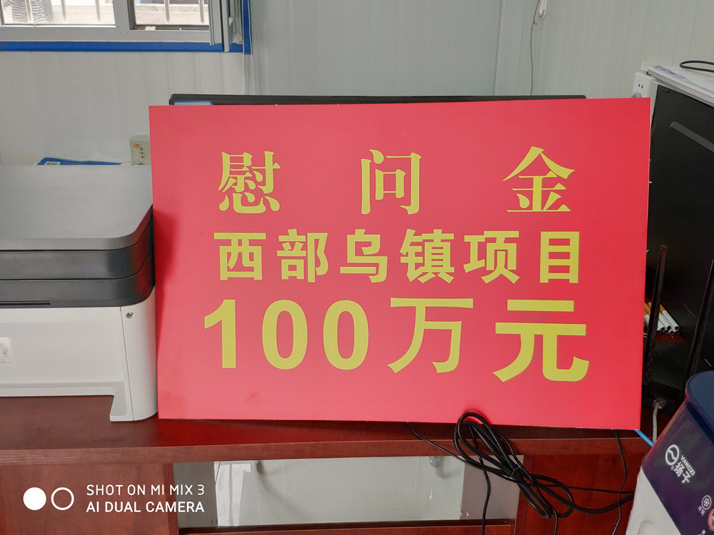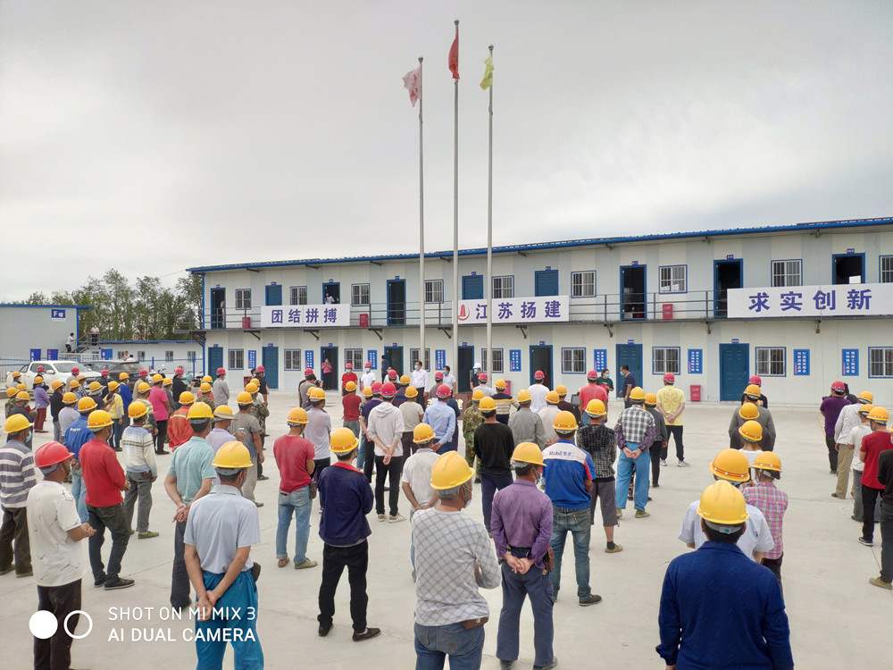 在項(xiàng)目部現(xiàn)場(chǎng),項(xiàng)目施工一線工人代表及項(xiàng)目管理人員列隊(duì)歡迎前來慰問的區(qū)、鎮(zhèn)兩級(jí)領(lǐng)導(dǎo)。首先,烏爾禾區(qū)委常委宣傳部張彥軍部長(zhǎng)發(fā)表講話,他高度贊揚(yáng)了揚(yáng)建西部烏鎮(zhèn)項(xiàng)目部。在新冠病毒防疫抗疫期間,項(xiàng)目部顧全大局,嚴(yán)格遵守防疫要求,與烏爾禾區(qū)同甘共苦、共筑抗疫防線;項(xiàng)目指揮部在防疫防控人員流動(dòng)的大環(huán)境下,克服重重困難,利用現(xiàn)有條件和資源組織項(xiàng)目各工區(qū)內(nèi)循環(huán),合理調(diào)配僅有資源,精心組織好施工生產(chǎn),最大限度地降低疫情防控造成的損失。為表彰慰問西部烏鎮(zhèn)項(xiàng)目部,烏爾禾區(qū)委、區(qū)政府向每位項(xiàng)目參建施工人員發(fā)放慰問金500元。隨后,在慰問金發(fā)放儀式上,烏爾禾區(qū)黨委薛宏舜書記向西部烏鎮(zhèn)項(xiàng)目負(fù)責(zé)人吳祥林遞交了慰問金100萬元憑證。
