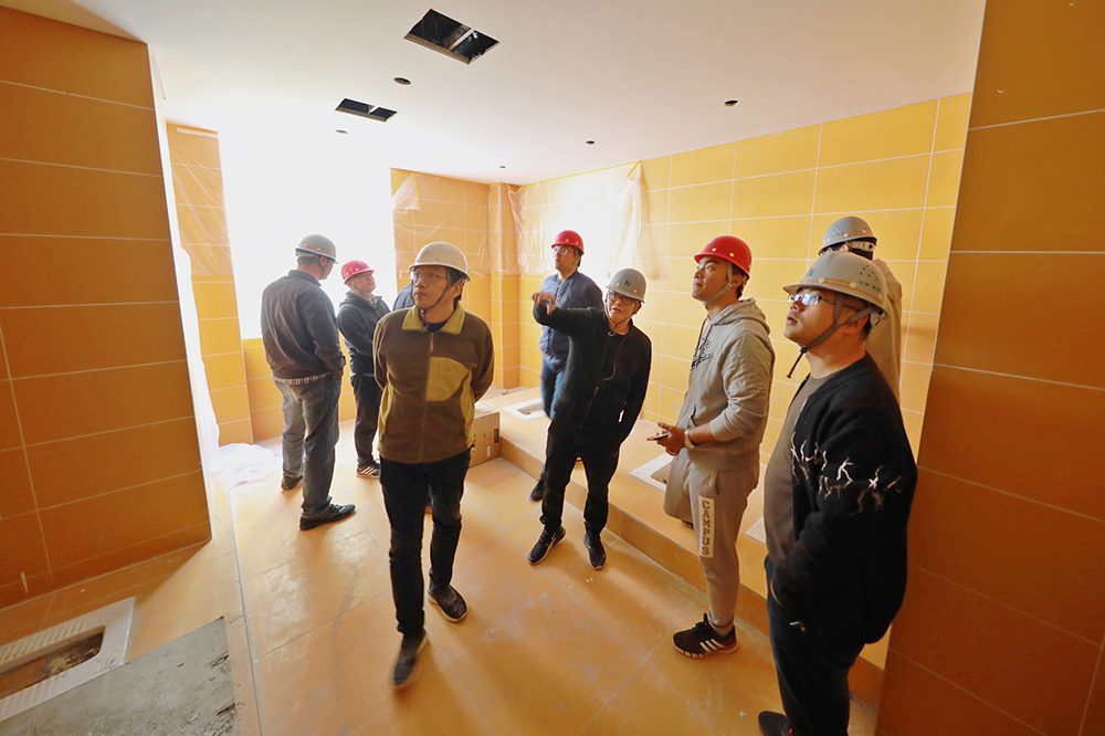 在觀摩過程中,項目部就施工現(xiàn)場各區(qū)域的亮點(如圖書館弧形鋁方管格柵接縫處理、墻與頂面、墻與柱面連接處的凹槽處理、教室入口處金屬裝飾板的排版及材質選擇、南北大走廊金屬吊頂?shù)呐虐媾c連接、衛(wèi)生間墻地磚的排版及與衛(wèi)生潔具的配合施工、不銹鋼小便槽施工等)向觀摩人員作了一一介紹。大家在觀摩學習的過程當中,積極提問,邊聽邊拍照,認真記錄每一個好的經驗和細部。