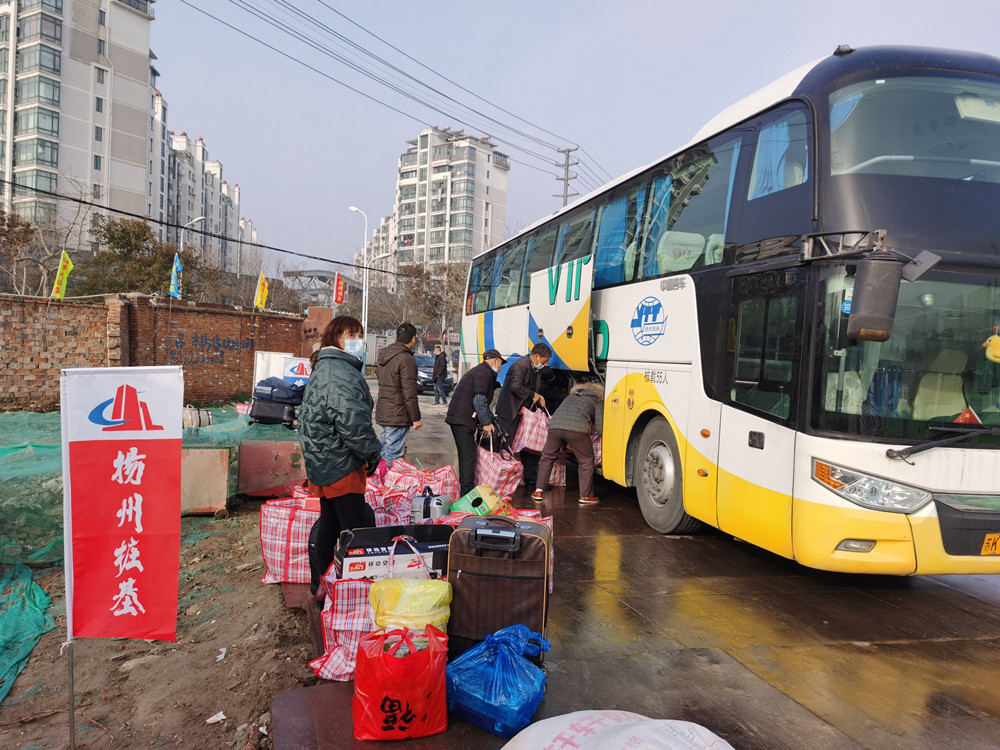 揚(yáng)建網(wǎng)訊 2月6日上午,樁基公司在210工地包車專程送25名農(nóng)民工返鄉(xiāng)過年。樁基工會主席蔣珍如、外埠管理公司負(fù)責(zé)人于冠云到場為大家送行。
