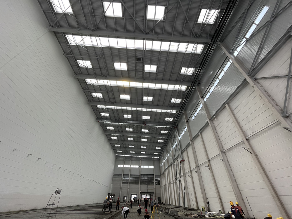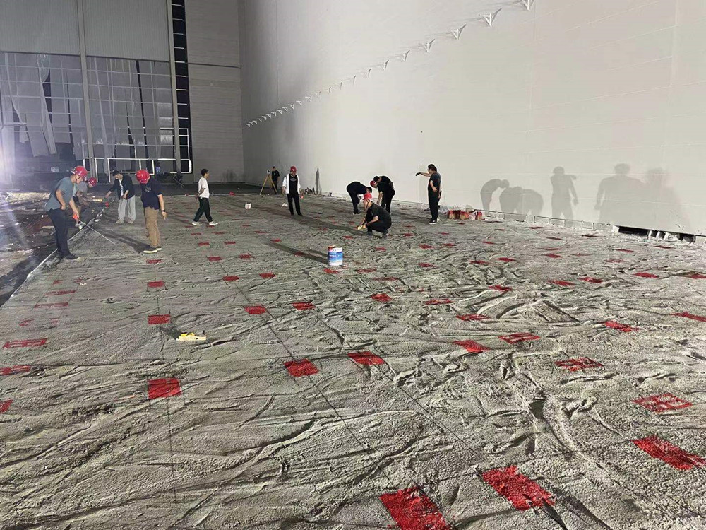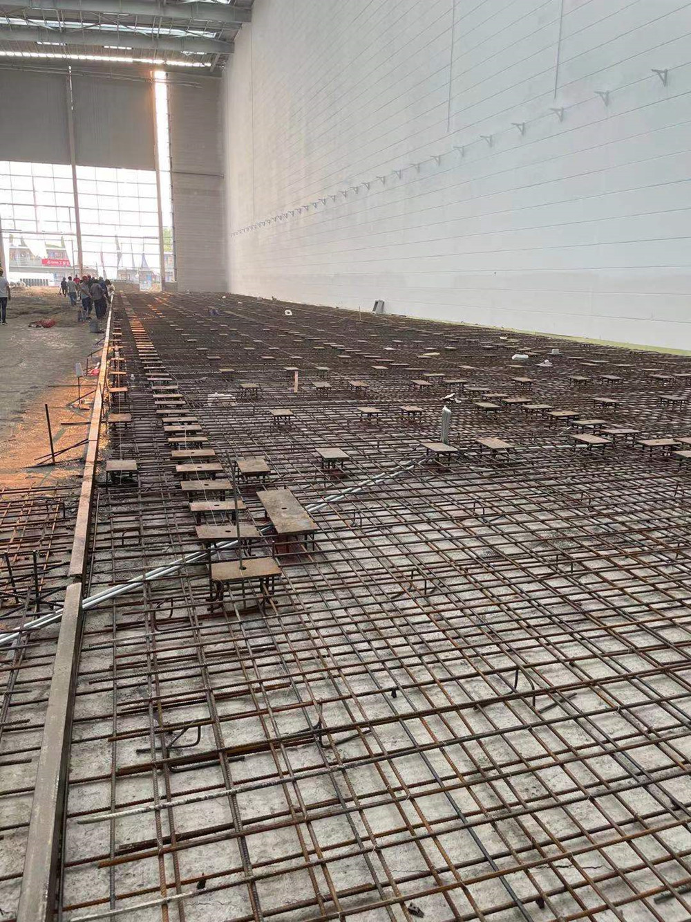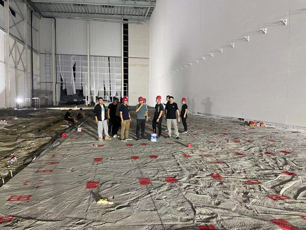 同時(shí)進(jìn)場(chǎng),分進(jìn)合擊。隔墻板安裝隊(duì)組、地坪隊(duì)組、油漆隊(duì)組等多家隊(duì)組同時(shí)入場(chǎng)施工,面對(duì)多隊(duì)組交叉作業(yè),項(xiàng)目部做好了充分的計(jì)劃安排及保障措施。4000多平方米、24米高的立面隔墻板安裝,兩家隊(duì)組從東西兩個(gè)方向同時(shí)安裝,30個(gè)工人,耗時(shí)140多小時(shí),安裝了2000多塊隔墻板。過程中,安裝隊(duì)組攻克了預(yù)制的ALC墻板訂貨周期長、工人在夏季長時(shí)間高空作業(yè)等各種困難。油漆隊(duì)組緊跟安裝隊(duì)組,隔墻板裝好一個(gè)工作面就緊跟另一個(gè)工作面。墊層、防潮膜、保護(hù)層、放線、扎鋼筋、鐵件預(yù)埋、關(guān)模、澆筑地坪……在有限的時(shí)間里道道工序,層層把關(guān),都有條不紊地順利完成。