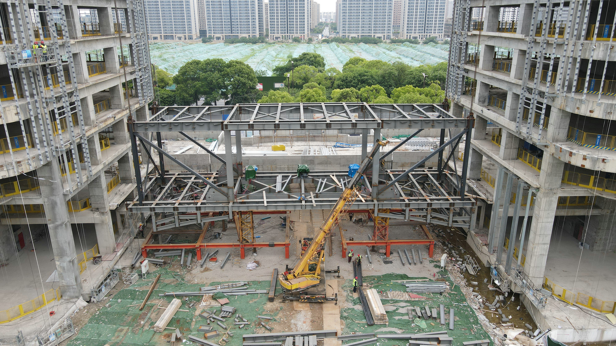 建工科技園鋼結(jié)構(gòu)連廊預(yù)提升順利完成