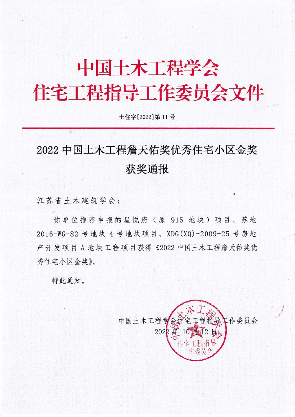 揚(yáng)建網(wǎng)訊 近日,中國土木工程學(xué)會住宅工程指導(dǎo)工作委員會揭曉了“2022年中國土木工程詹天佑獎優(yōu)秀住宅小區(qū)金獎入選工程”名單,集團(tuán)公司承建的星悅府(原915地塊)住宅項(xiàng)目在眾多項(xiàng)目中突出重圍,斬獲金獎。