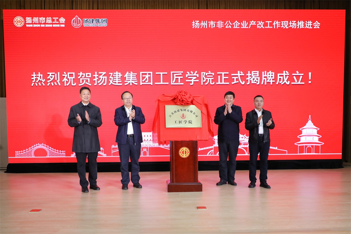 韓方、蔣元峰、楊浩、康往東、劉海斌等領(lǐng)導(dǎo)為新成立的揚建工匠學(xué)院揭牌,并向第一屆“揚建工匠”頒發(fā)榮譽證書。