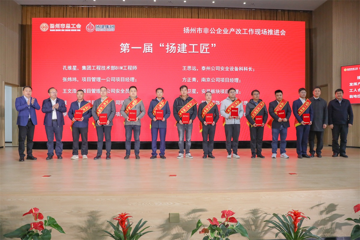 揚建網(wǎng)訊 11月10日下午,揚州市非公企業(yè)產(chǎn)改工作現(xiàn)場推進(jìn)會在揚建集團(tuán)產(chǎn)業(yè)園舉行。市人大常委會副主任、黨組副書記、市總工會主席韓方,市總工會黨組書記、副主席蔣元峰、副主席韓士軍、孫凌雷、楊浩、伍瑞慶,揚建集團(tuán)黨委書記、董事長康往東等領(lǐng)導(dǎo),以及市產(chǎn)改聯(lián)席會議成員單位、市總工會各部室、產(chǎn)業(yè)工會和直屬單位、各縣(市、區(qū))總工會有關(guān)負(fù)責(zé)人,非公企業(yè)、工匠學(xué)院、社會組織代表,揚建集團(tuán)職工代表共200余人參加活動。