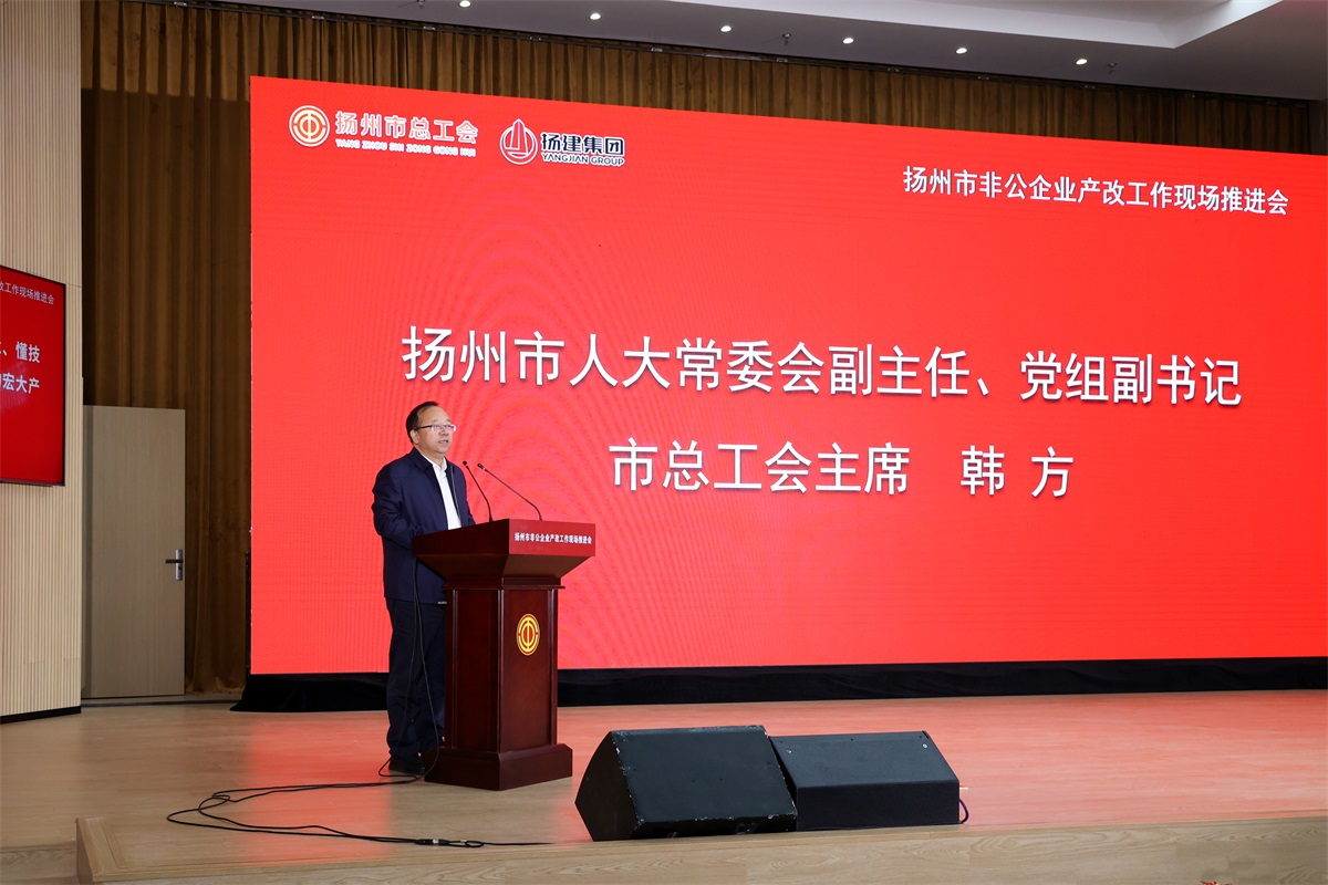 韓方在作總結(jié)講話時指出,召開推進(jìn)會旨在進(jìn)一步落實習(xí)近平總書記在同中華全國總工會新一屆領(lǐng)導(dǎo)班子成員集體談話時的重要講話精神以及中國工會十八大精神,促進(jìn)全市非公企業(yè)產(chǎn)改工作擴面提質(zhì)增效。他高度評價了揚建集團(tuán)產(chǎn)改工作所起到的示范引領(lǐng)作用,對全市非公企業(yè)產(chǎn)改工作提出三點要求:一是提高站位,充分認(rèn)識推動非公企業(yè)產(chǎn)改工作的重要意義。二是聚焦重點,以更大力度推動非公企業(yè)產(chǎn)改工作取得實效。三是統(tǒng)籌資源,凝聚推進(jìn)非公企業(yè)產(chǎn)改工作合力。在市委市政府的堅強領(lǐng)導(dǎo)下,守正創(chuàng)新、發(fā)力奮進(jìn),實干爭先、團(tuán)結(jié)奮斗,鍥而不舍推進(jìn)全市非公企業(yè)產(chǎn)改工作取得新突破、結(jié)出新碩果,為全面推進(jìn)中國式現(xiàn)代化揚州新實踐做出更大貢獻(xiàn)。